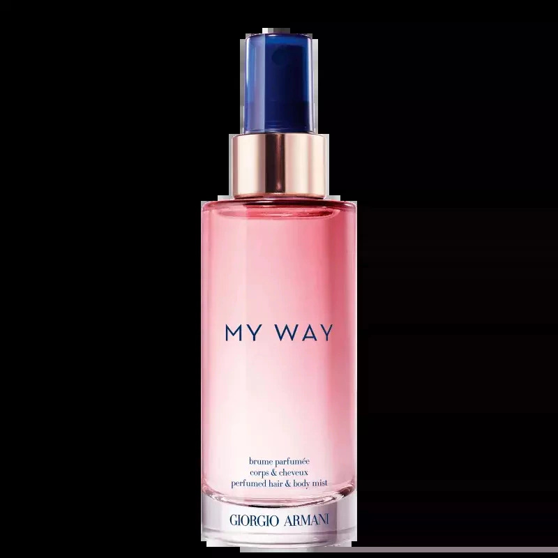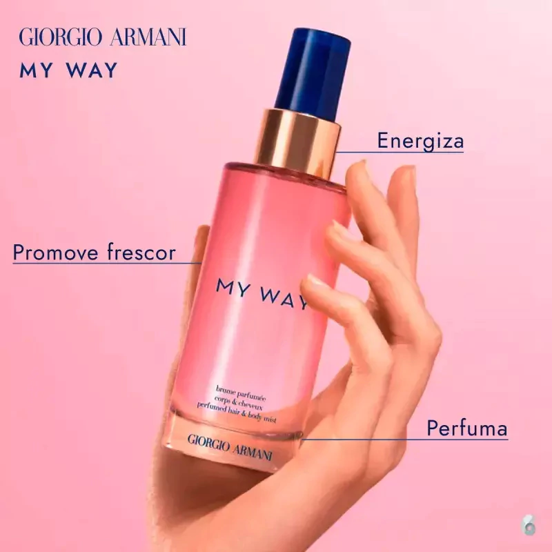 A Bruma para Corpo e Cabelo Giorgio Armani My Way é composta por óleo de macadâmia da Guatemala e óleo de arroz da Tailândia, inspirada no ritual do arroz nuka, tradicionalmente usado pelas japonesas para suavizar o cabelo e a pele. Possui notas de topo de flor de laranjeira e bergamota, notas de corpo com tuberosa e jasmim e finaliza com notas de fundo de almíscar branco, baunilha de madagascar e cedro da virgínia. Conta com 90% de ingredientes naturais e orgânicos.