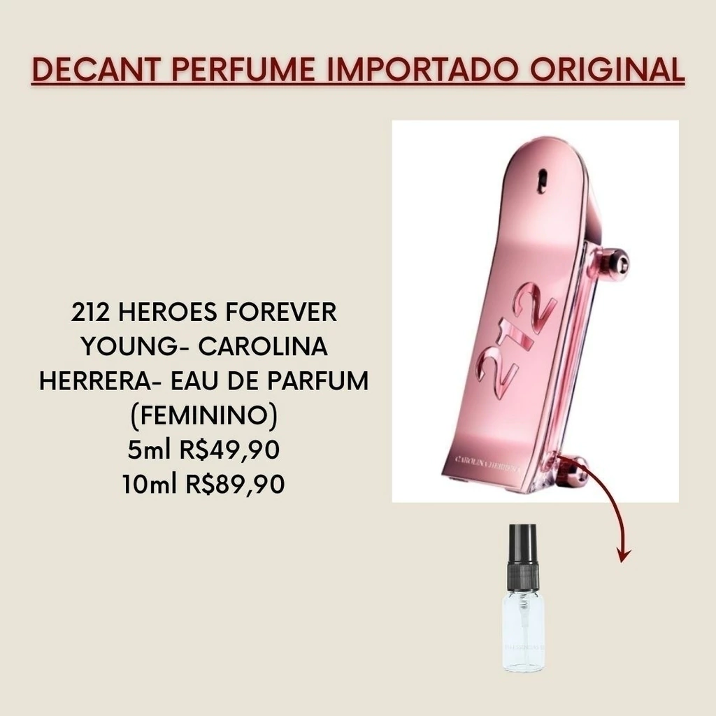 212 Heroes Forever Young de Carolina Herrera é um perfume Floral Frutado Feminino. Esta é uma nova fragrância. 212 Heroes Forever Young foi lançada em 2022. 212 Heroes Forever Young foi criado por Marie Salamagne, Alberto Morillas e Dora Baghriche. As notas de topo são: Framboesa e Mandarina. As notas de coração são: Jasmim e Flor de Laranjeira. As notas de fundo são: Cedro e Sândalo.