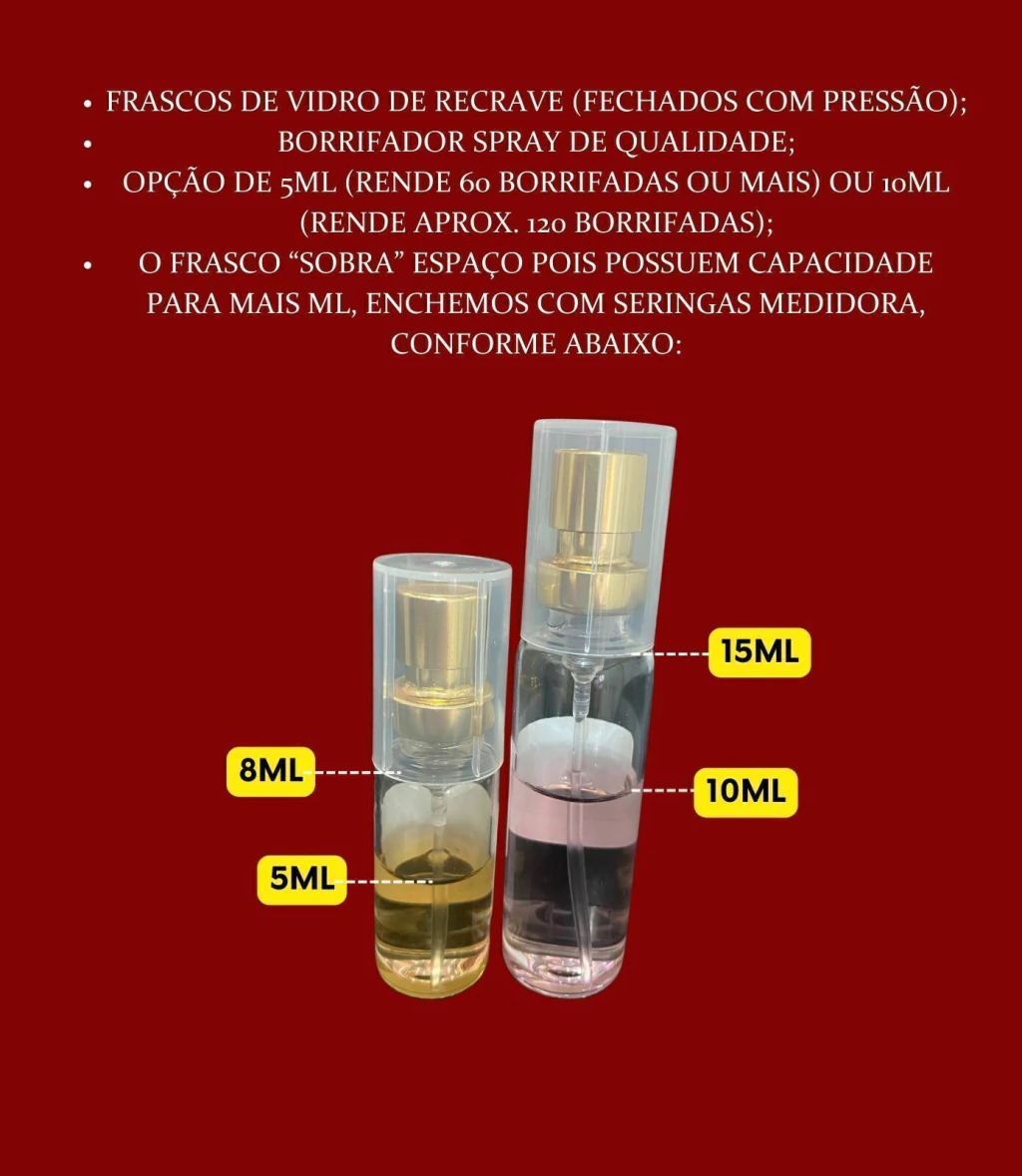 DECANTS SÃO PERFUMES ORIGINAIS FRACIONADOS EM FRASCOS MENORES DE 5ML (rende apox. 60 borrifadas) OU 10ML (aprox. 120 borrifadas) , PARA QUE VOCÊ POSSA SENTIR A FRAGRÂNCIA EM SUA PELE ANTES DE COMPRAR O FRASCO GRANDE DO SEU IMPORTADO PREFERIDO.