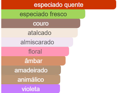 As notas de topo são: Cardamomo, Açafrão, Violeta e Cominho. As notas de coração são: Camurça, Noz-moscada, Osmanthus e Cravo-da-Índia. As notas de fundo são: Âmbar Cinzento, Notas Amadeiradas, Musgo de Carvalho e Almíscar.