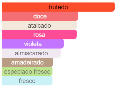 As notas de topo são: Frutas Vermelhas, Framboesa, Rosa, Violeta e Pêssego. As notas de coração são: Gerânio Rosa e Íris. As notas de fundo são: Almíscar Branco e Cedro.