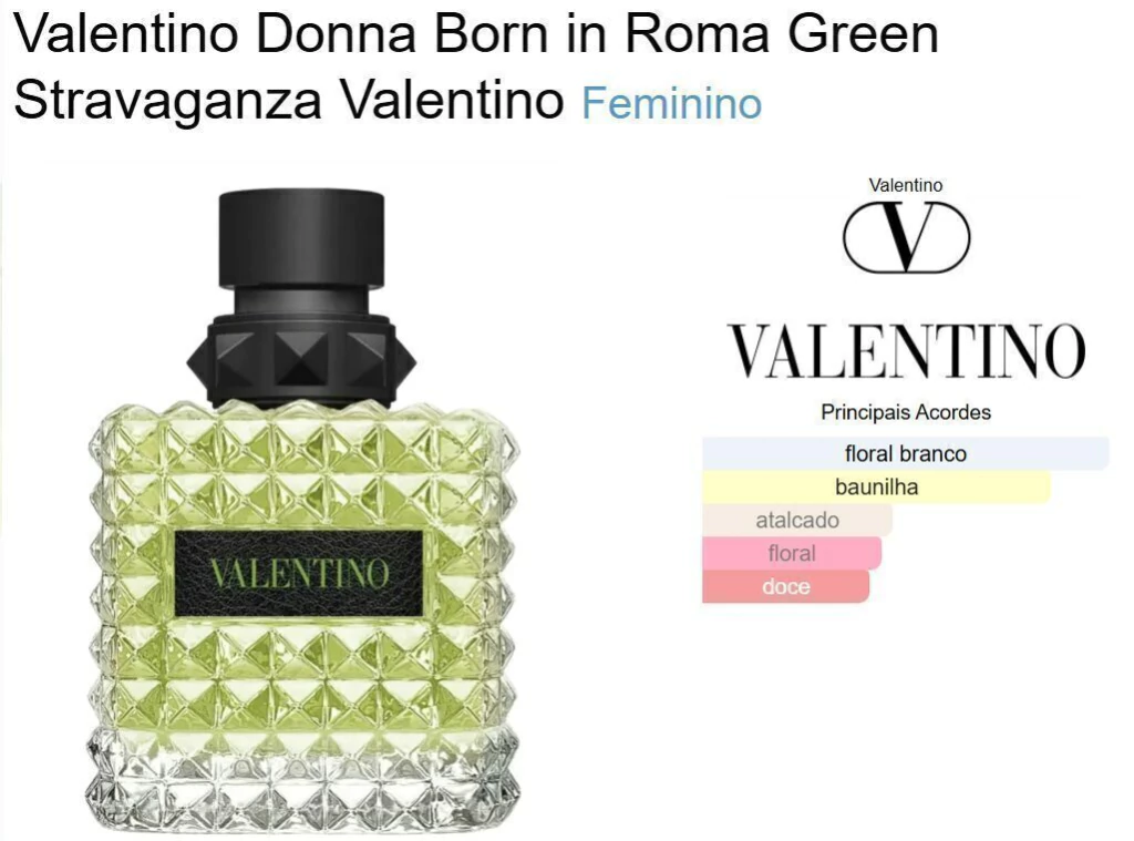 Valentino Donna Born in Roma Green Stravaganza de Valentino é um perfume Feminino. A nota de topo é Chá Preto LapSang SouChong. A nota de coração é Jasmim. A nota de fundo é Baunilha.