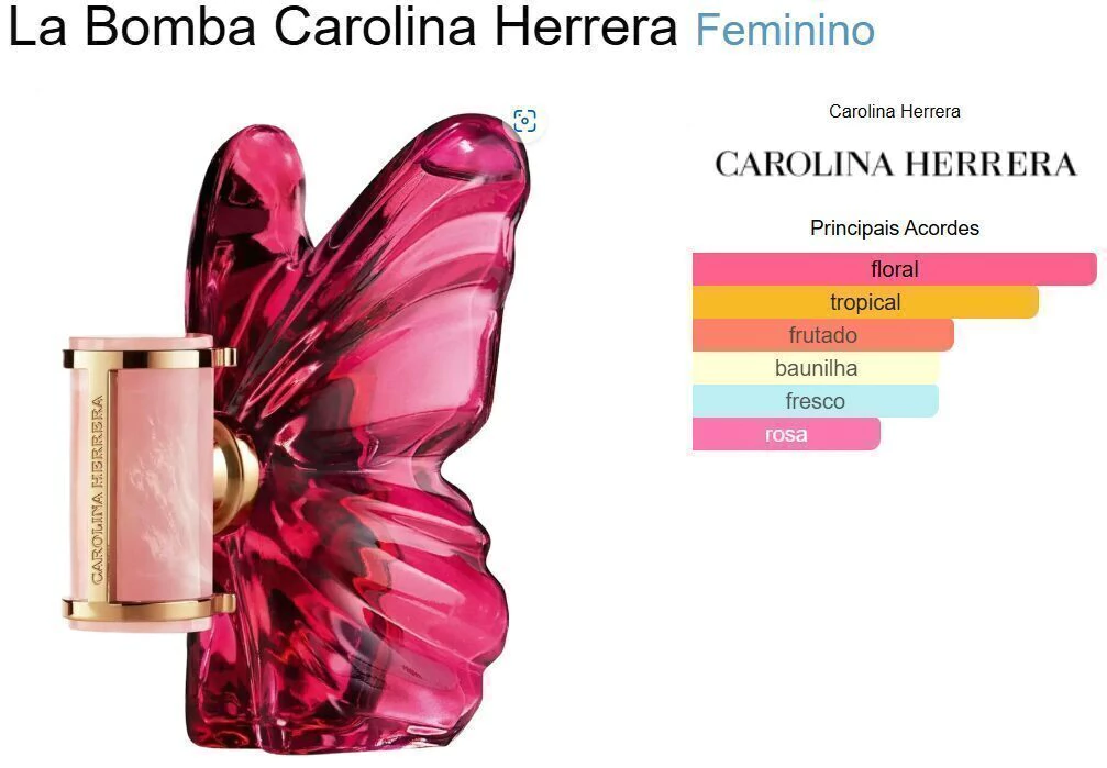 La Bomba de Carolina Herrera é um perfume Oriental Floral Feminino. A nota de topo é Pitaia. As notas de coração são: Peônia Vermelha e Jasmim-Manga. As notas de fundo são: Baunilha e Patchouli.