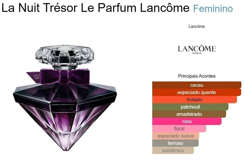 La Nuit Trésor Le Parfum de Lancôme é um perfume Floral Frutado Gourmet Feminino. A nota de topo é Groselha Preta. A nota de coração é Rosa. As notas de fundo são: Cacau e Patchouli.
