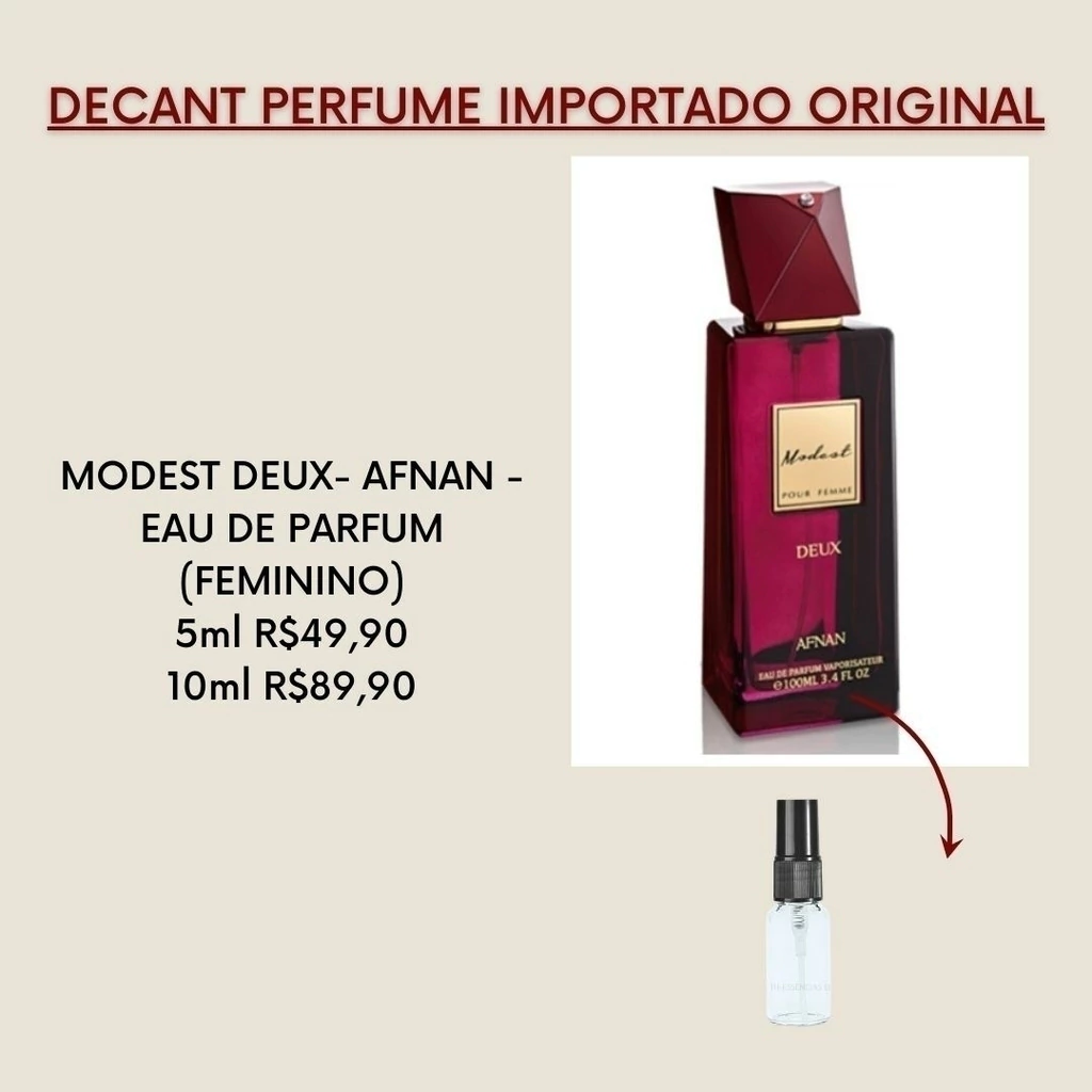 Modest Deux de Afnan é um perfume Feminino. Modest Deux foi lançada em 2019. As notas de topo são: Morango, Framboesa, Chocolate amargo e Cereja. As notas de coração são: Baunilha e Especiarias. As notas de fundo são: Patchouli, Gardênia e Almíscar.