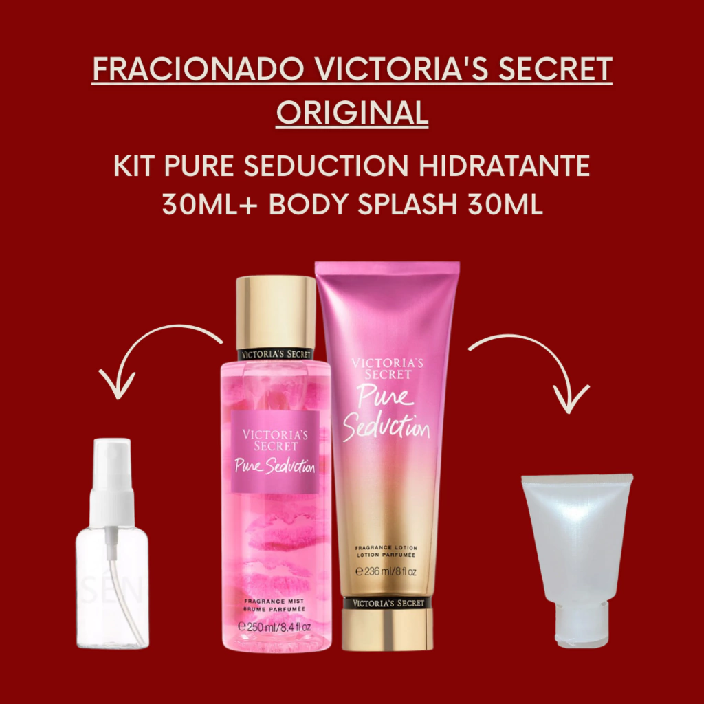 O Kit acompanha 30ml do Hidratante + 30ml do Body Splahs em frascos transparentes com etiqueta contendo nome da fragrância.