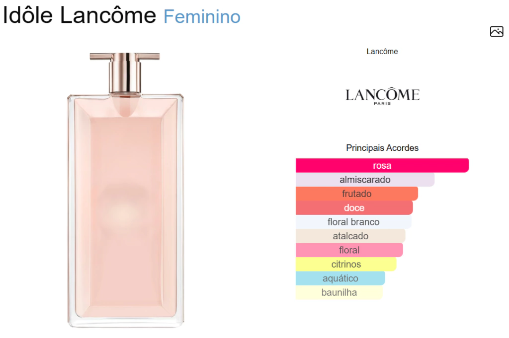 1- Idôle de Lancôme é um perfume Chipre Floral Feminino. As notas de topo são: Pera, Bergamota e Pimenta Rosa. As notas de coração são: Rosa e Jasmim. As notas de fundo são: Almíscar Branco, Baunilha, Patchouli e Cedro.