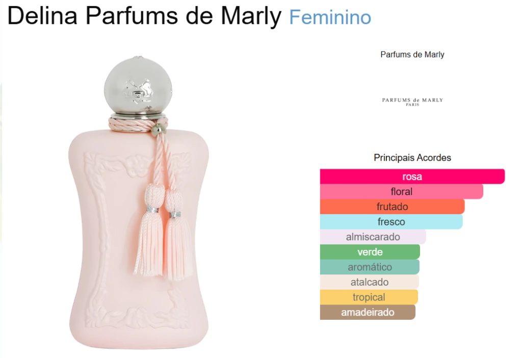 3- Delina de Parfums de Marly é um perfume Floral Feminino.As notas de topo são: Lichia, Ruibarbo, Bergamota e Noz-moscada. As notas de coração são: Rosa Turca, Peônia, Almíscar, Petalia e Baunilha. As notas de fundo são: Cashmeran, Incenso, Cedro e Vetiver do Haiti.