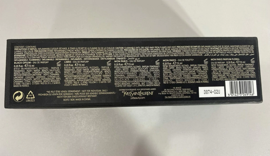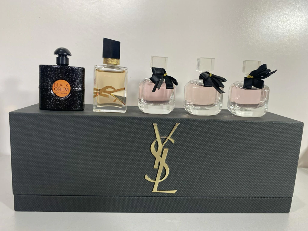 KIT 5 MINIATURAS ORIGINAIS YVES SAINT LAURENT: BLACK OPIUM EDP 7,5ML + LIBRE EDP 7,5ML+ MON PARIS EDP 7,5ML + MON PARIS EDT 7,5ML + MON PARIS PARFUM FLORAL 7,5ML