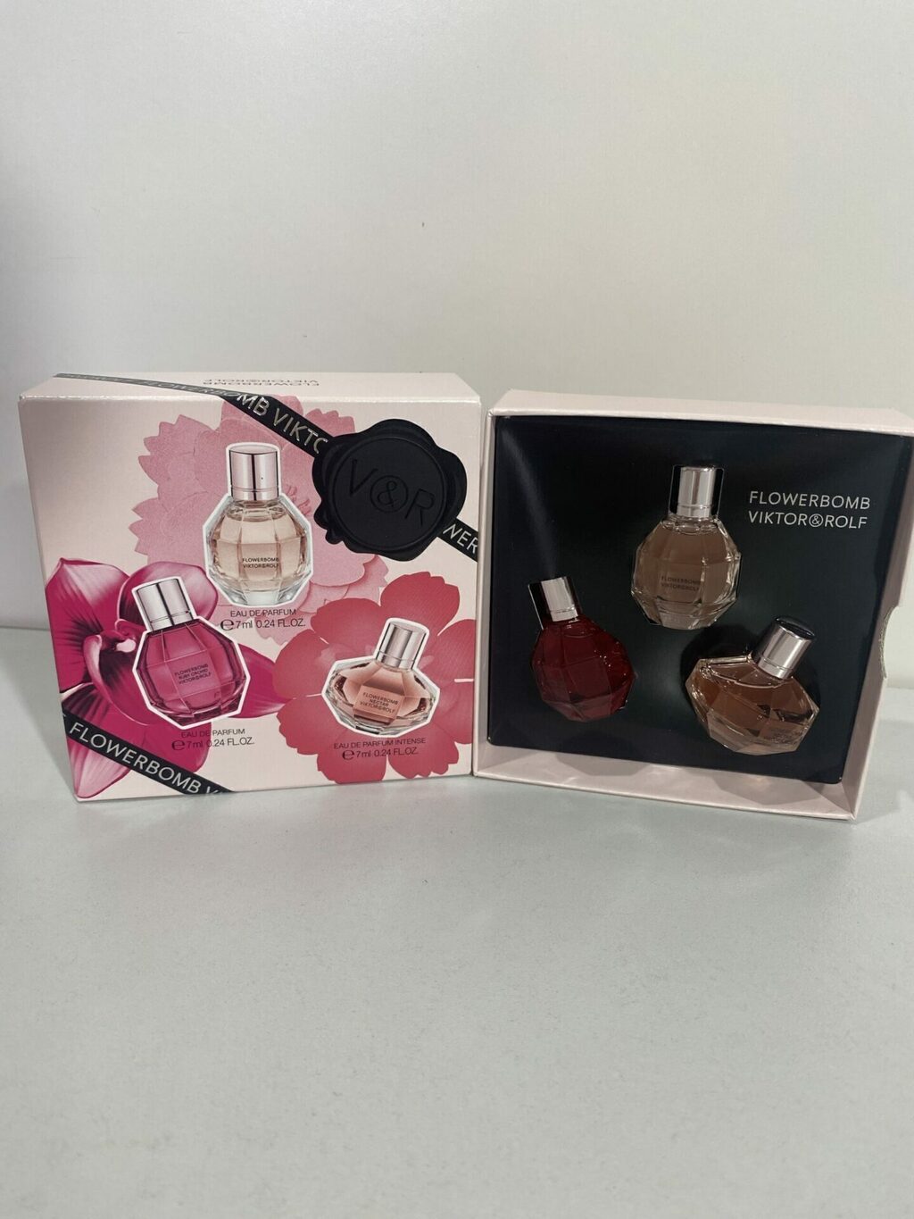 Kit de miniaturas originais Femininas Viktor & Rolf: 3 miniaturas com 7ml cada 1 Flowerbomb edp + 1 Flowerbomb néctar + 1 Flowerbomb Ruby Orchid