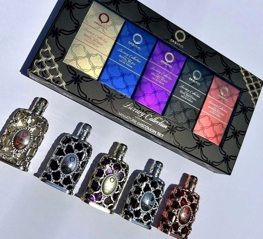 O kit contém 7 miniaturas da marca árabe Orientica: Royal Bleu 7,5ml + Velvet Gold 7,5ml + Royal Amber 7,5ml + Amber Rouge 7,5ml + Oud Saffron 7,5ml