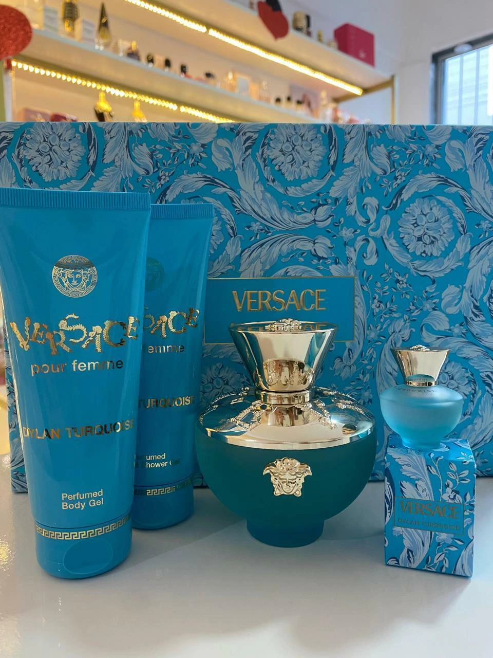O KIT CONTÉM: 1 Perfume Feminino Versace Dylan Turquoise 100ml + 1 miniatura de 5ml + 1 gel de banho 100ml + 1 hidratante 100ml