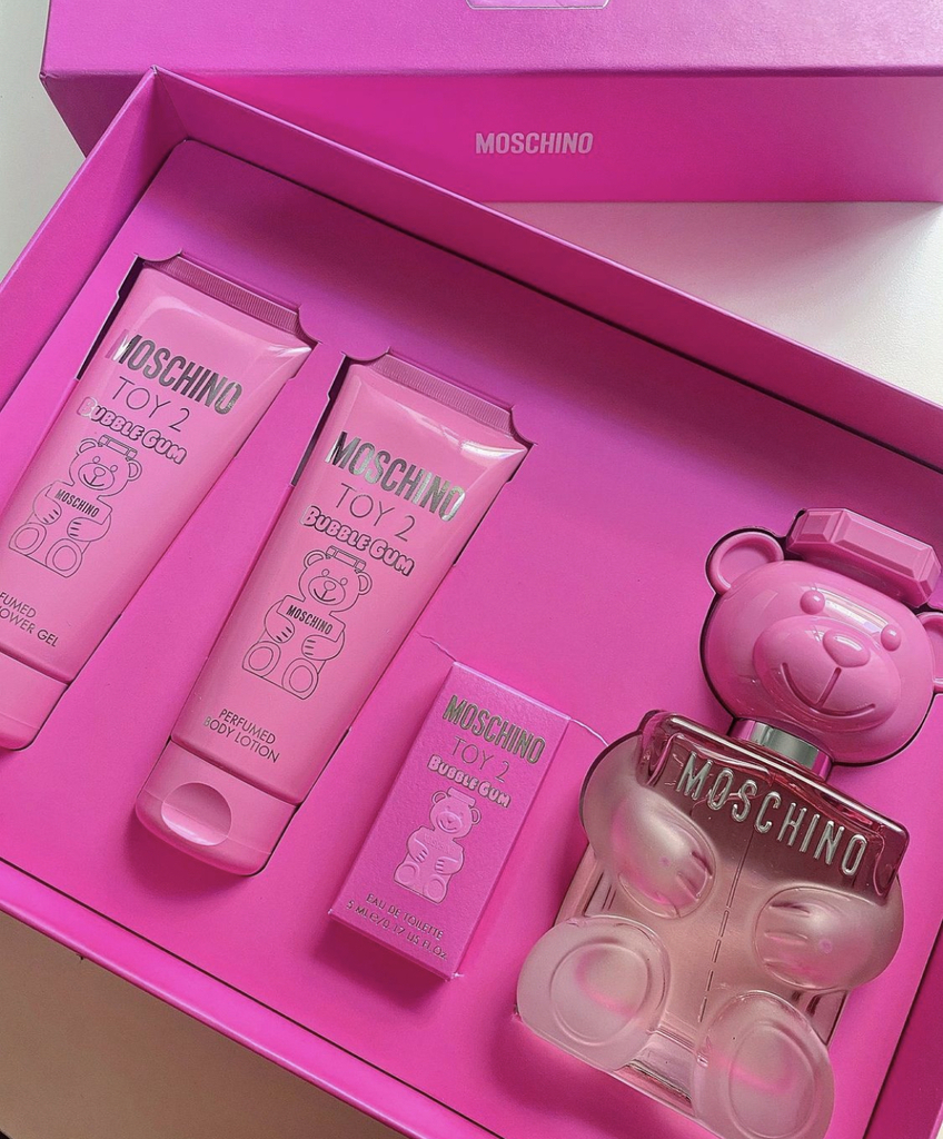 O kit contém: 1 Perfume Moschino Toy 2 Bubble Gum 100ml + 1 Hidratante 100ml + 1 Gel Corporal de Banho 100ml + 1 Miniatura 5ml do mesmo perfume.