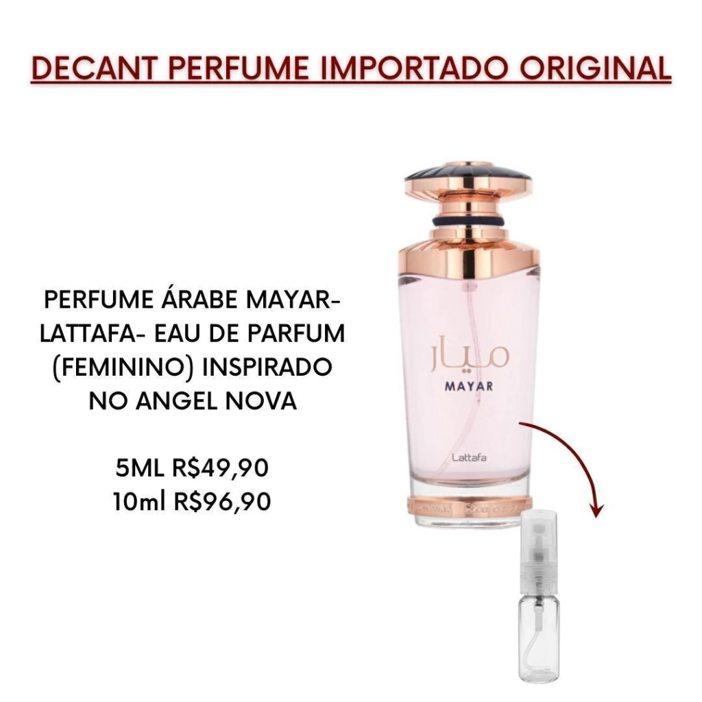 Mayar de Lattafa Perfumes é um perfume Floral Frutado Feminino. Esta é uma nova fragrância. Mayar foi lançada em 2022. As notas de topo são: Lichia, Framboesa e Folha de Violeta. As notas de coração são: Peônia, Rosa Branca e Jasmim. As notas de fundo são: Baunilha e Almíscar.