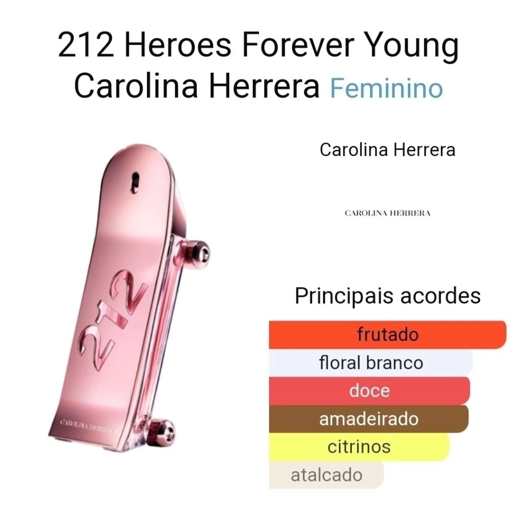 212 Heroes Forever Young de Carolina Herrera é um perfume Floral Frutado Feminino. Esta é uma nova fragrância. 212 Heroes Forever Young foi lançada em 2022. 212 Heroes Forever Young foi criado por Marie Salamagne, Alberto Morillas e Dora Baghriche. As notas de topo são: Framboesa e Mandarina. As notas de coração são: Jasmim e Flor de Laranjeira. As notas de fundo são: Cedro e Sândalo.