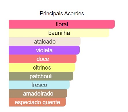 As notas de topo são: Violeta, Mandora e Bergamota. As notas de coração são: Glicínia, Osmanthus e Rosa. As notas de fundo são: Fava Tonka, Baunilha e Patchouli.
