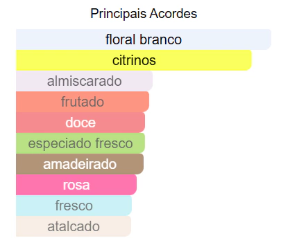 As notas de topo são: Néroli, Pera, Bergamota, Toranja e Limão. As notas de coração são: Flor de Laranjeira, Jasmim de Madagascar, Rosa, Pêssego e Groselha Preta. As notas de fundo são: Almíscar, Cedro, Madeira de Cashmir e Patchouli.