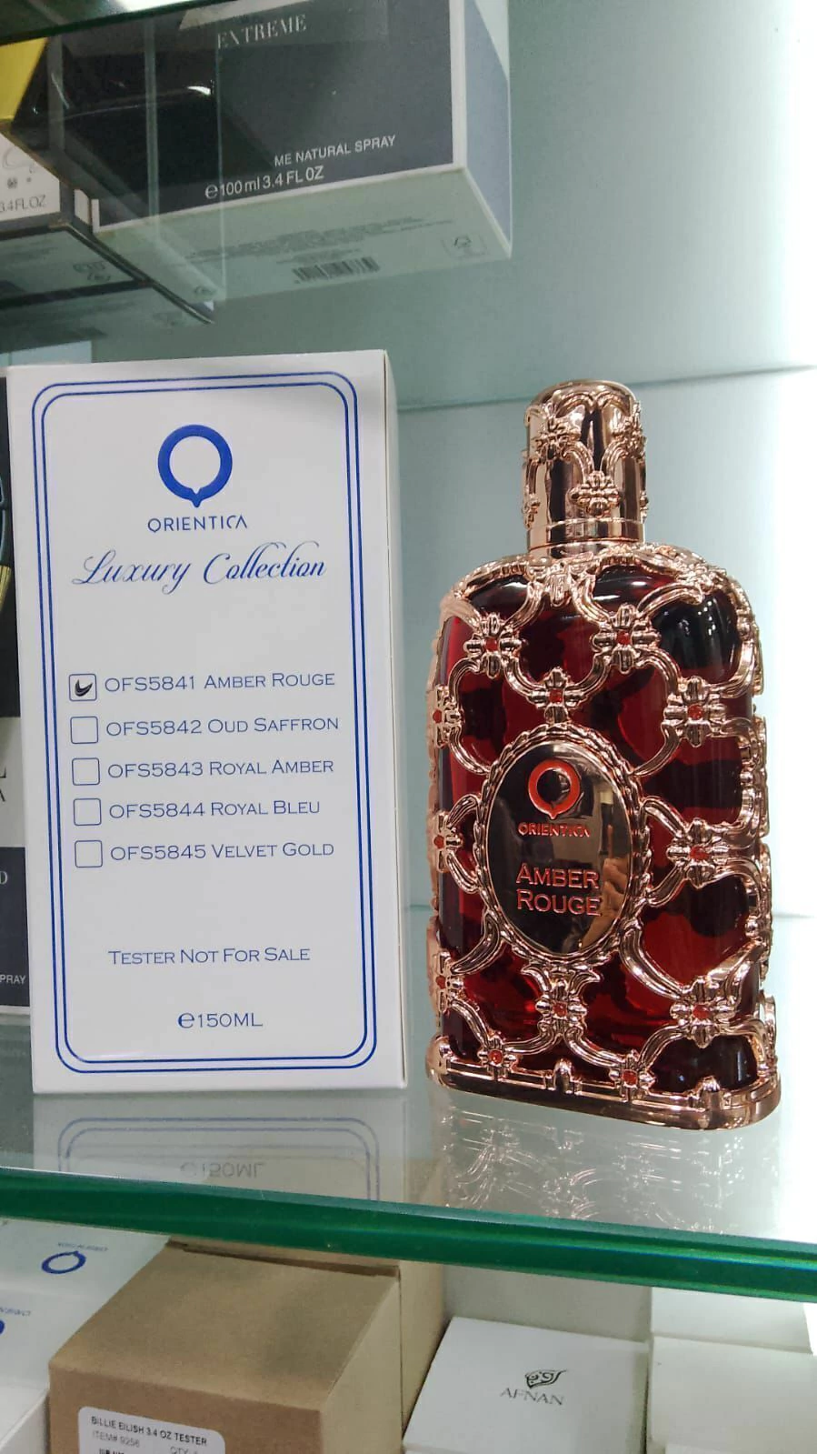 Amber Rouge de Orientica Premium é um perfume Amadeirado Especiado Compartilhável. As notas de topo são: Açafrão e Jasmim. As notas de coração são: Madeira de Âmbar e Âmbar Cinzento. As notas de fundo são: Cedro e Resina de Abeto.